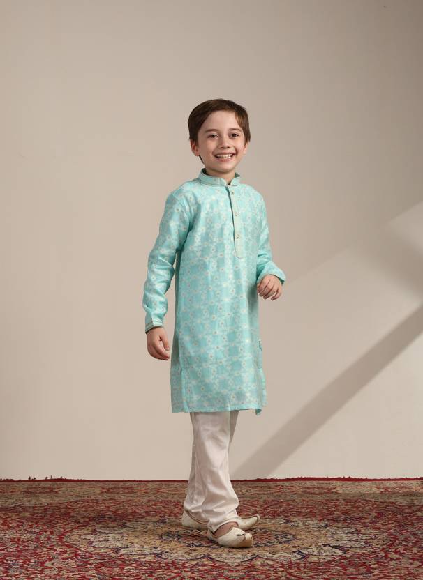 Manyavar Green Blended Cotton Self design Mandarin Collar Traditional Kurta Pyjama Set For Child