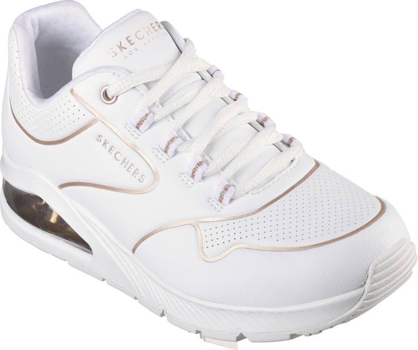 Stand out in cool hues and fresh style with Skechers Street? Uno 2 – Golden Trim. This fashion lace-up features a synthetic upper with gold trim detailing, a Skechers Air-Cooled Memory Foam? insole, and a platform wedge with a visible Skech-Air? midsole.